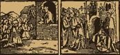 Eine Karte zeigt die Ausdehnung des Bistums Havelberg. Ausstellungsstücke wie Siegelabdrücke und Kupferstich-Porträts (17.Jh.) erinnern an einige Havelberger Bischöfe. Ein 15teiliger Einblatt-Holzschnitt aus dem frühen 16. Jahrhundert (Bild links) erzählt die Geschichte des "Wunders vom heiligen Blut". | ||||
